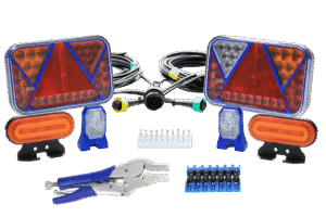 I vårt kompletta belysningskit ingår allt du behöver för att få en fungerande belysning på din släpvagn, du får huvudkabel med släpvagnskontakt, 2 baklampor, 2 sidomarkeringslampor, 2 positionslampor, smartkablar med kopplingar, upphängningsclips, tång och plastband. Med vårt system behöver du inte skarva eller skruva några kablar – allt kopplas enkelt ihop med bajonettkontakter.