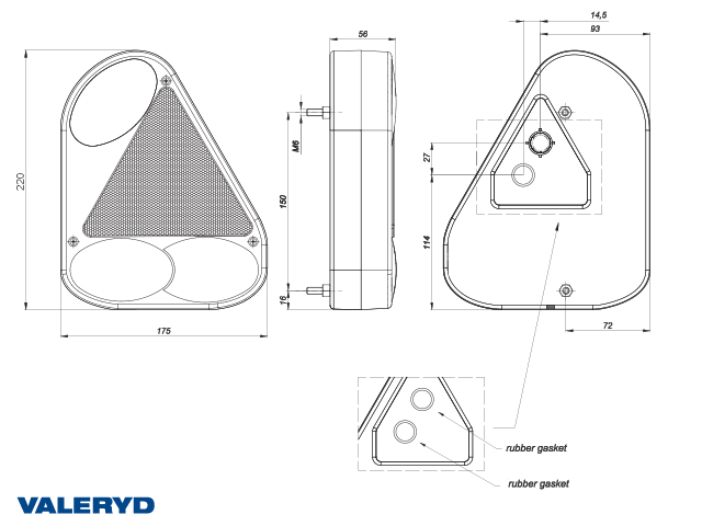 Baklampa Valeryd passar till Jokon Ear Vä 220x175x53mm Triangelreflex & backljus, kabelgenomföring
